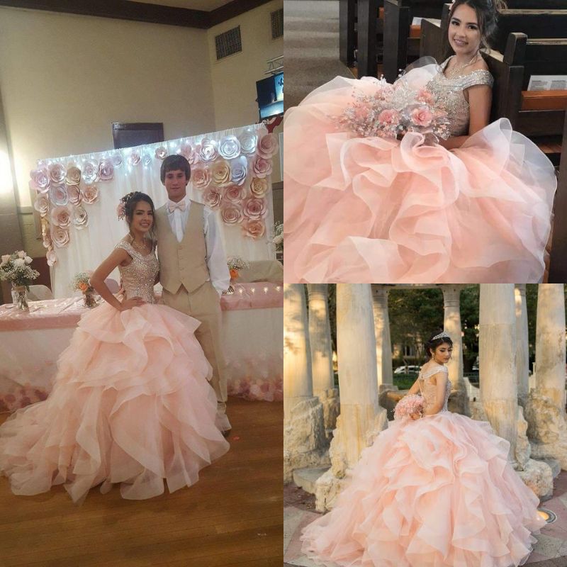 Vintage Masquerade Quinceanera Dresses Light Pink Boat Neck Beaded Puffy Ruffles Vestidos De Quinceanera Organza Sweet 15 Prom Party Gowns Peaches Quinceanera Dresses Prettiest Quinceanera Dresses From Bridalstore 106 Dhgate Com