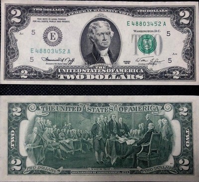 Congress is reviewing a $2 trillion economic stimulus package to support U.S. On the back is John Trumbull's painting, "The Signing of the Declaration of Independence." Advertisement The first $2 bills were issued in 1862, and had a picture Alexander Hamilton, founding father and the first secretary of the Treasury, the U.S. EDUCATIONAL SERIES 16 Designed NEW Legal Tender Bills $1/$2/$5 - Set of all 3 $49.95 18 CNY Chinese New YEAR OF THE DOG Polychromatic 8 COLOR Dogs $2 US Bill BLUE.