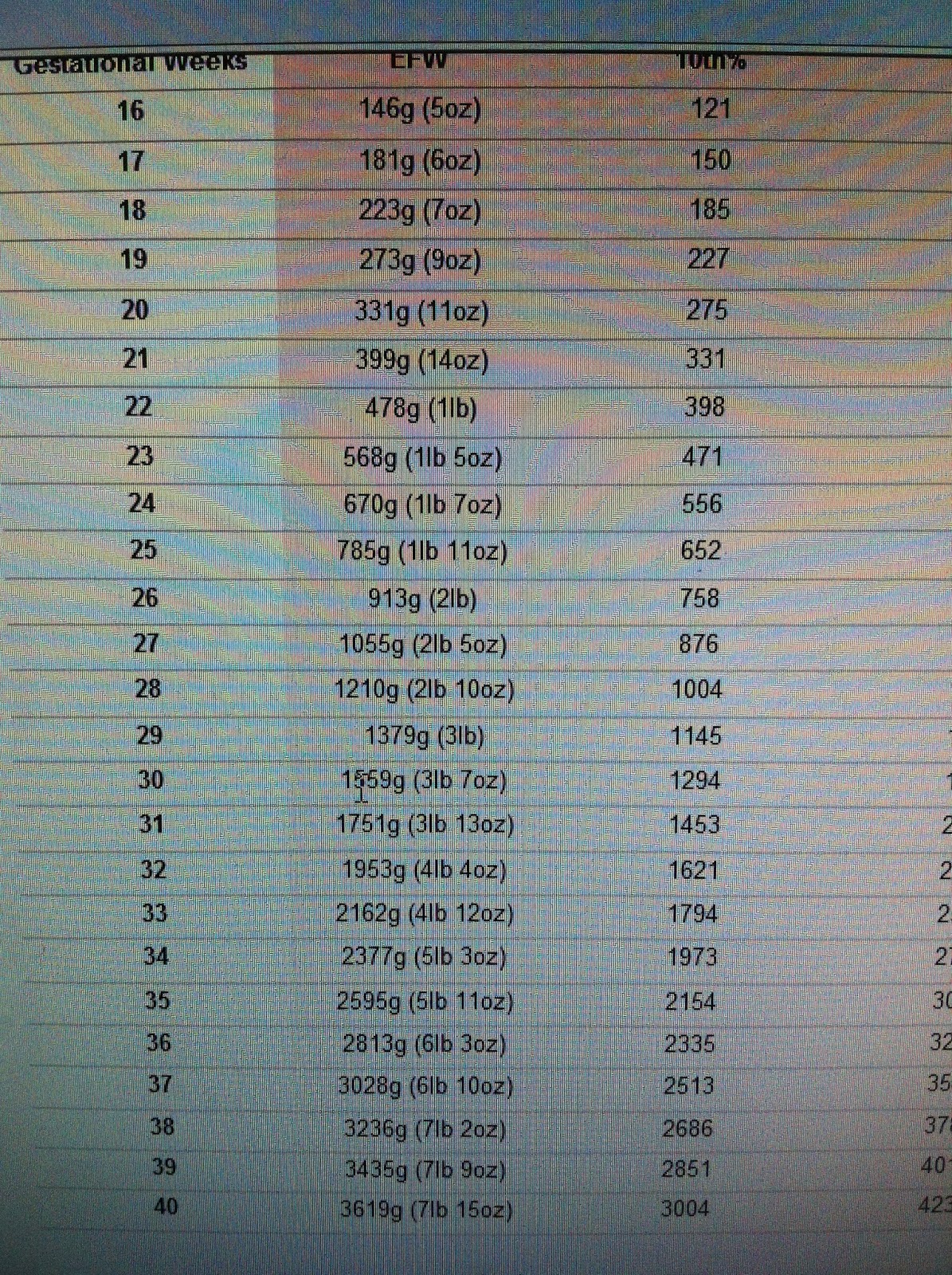 But once you add in the placenta, amniotic fluid, and extra blood, you've got at least 10 pounds of baby and their life-support gear smooshed up against your organs!. Because growth can vary for each baby during this time, your baby may be a little off from these measurements, which in most cases is completely normal. Your baby's brain and nervous system are now fully developed.