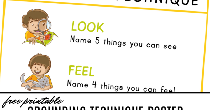 A couple of grounding techniques are described below. 5 - LOOK:Look around for 5 things that you can see, and say them out loud. This 5 senses grounding technique PDF is a variation for children that can be downloaded for FREE at this end of this post.